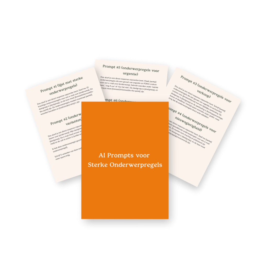 Ik heb voor ieder type e-mail titel een super krachtige prompt geschreven die je kunt kopiëren en plakken in ChatGPT om onweerstaanbare e-mail titels te schrijven. Hiermee bespaar je superveel tijd en worden jouw e-mail titels 10x beter. Dit is goud waard!Â