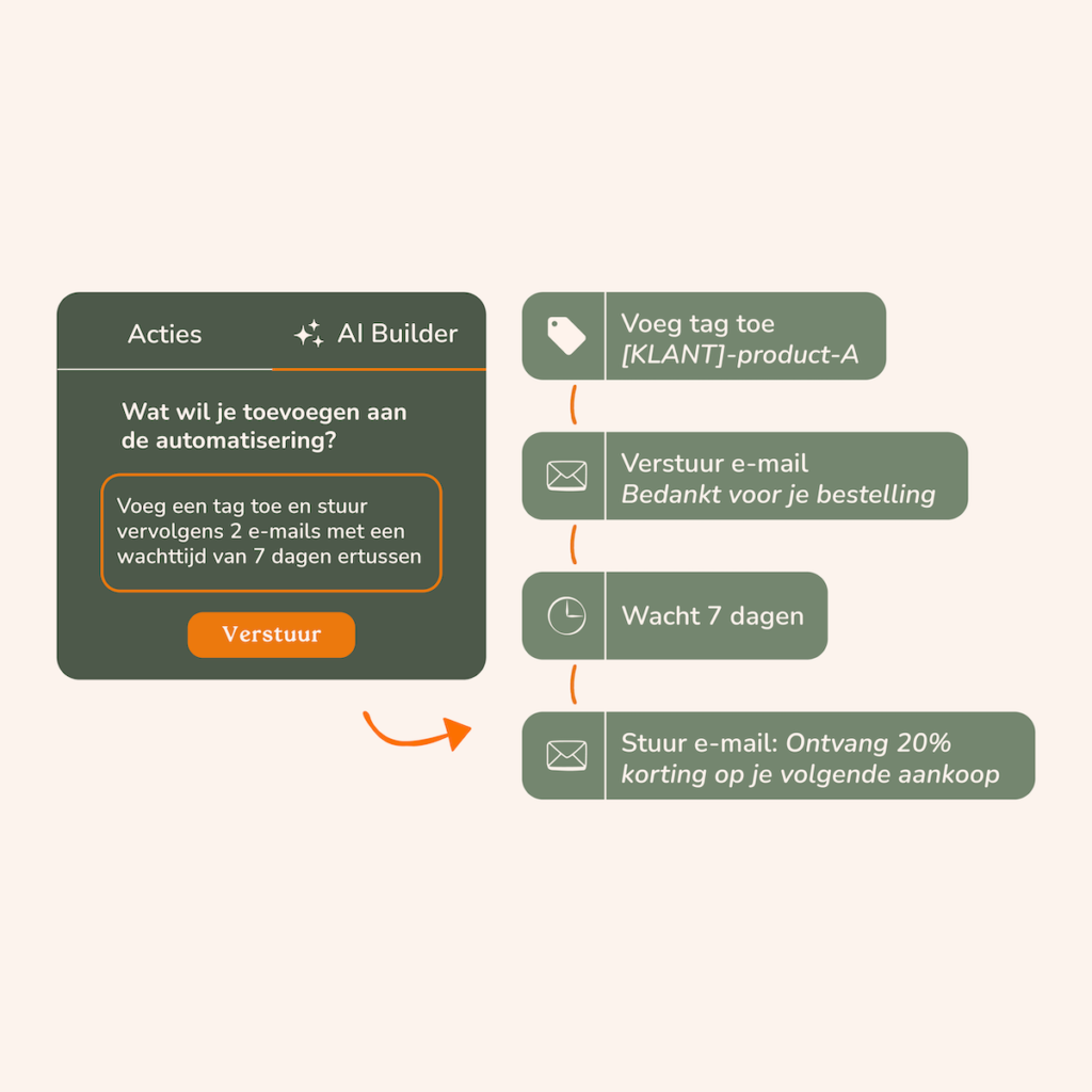 Met de AI Builder kun je complete automatiseringen genereren in MailTribe. Je geeft een opdracht wat voor automatisering gebouwd moet worden en binnen een paar seconden zie je de automatisering op je beeldscherm verschijnen. Dit bespaart je zeeën van tijd.