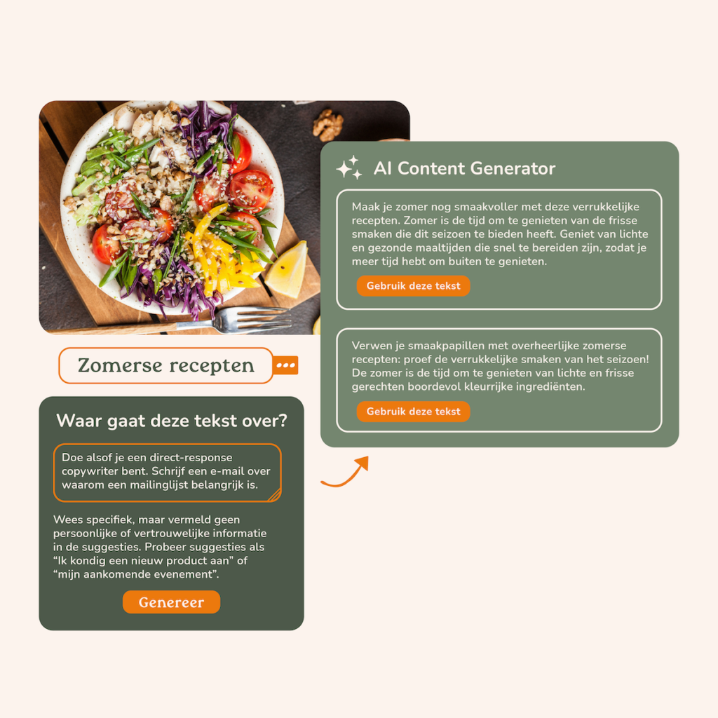 Tegenwoordig hoef je niet meer zelf alle e-mails te schrijven. Je kunt vanuit MailTribe de AI Content Tool gebruiken om teksten voor je te laten genereren. Je omschrijft waar jouw tekst over moet gaan en dan schrijft MailTribe meerdere varianten voor je, aangepast naar jouw eigen tone of voice. Ook kun je feedback geven zodat jouw teksten nog beter worden.