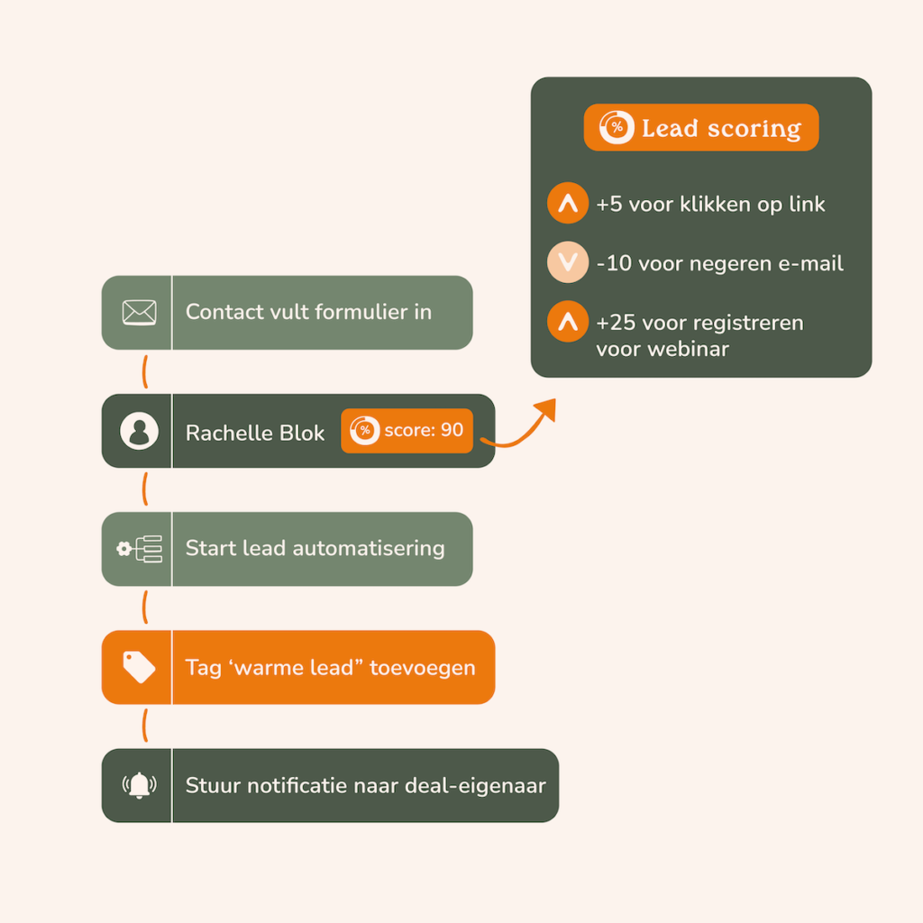 Via automatiseringen kun je automatisch de scores van je contacten verhogen of verlagen. Stel dat een contact 300 punten heeft bereikt, dan kun je je automatisch een e-mail sturen met een uitnodiging voor een gratis gesprek.